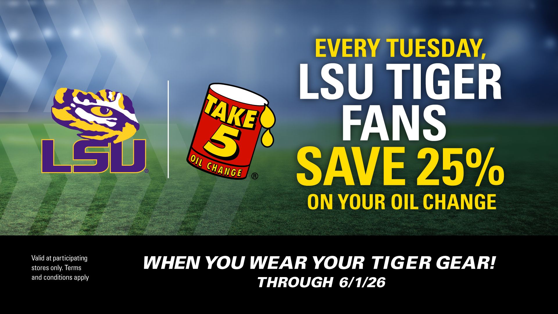 LSU fans, here’s the game plan: Tiger Tuesday at Take 5 Oil Change! Just wear your LSU gear and save 25% on your oil change. No huddle. No overtime. Just drive in, stay in your car, and roll out. You’ll be tailgate ready in 10 minutes flat. Keeping up with car care shouldn’t be a tough call – Take 5 makes it as easy as calling the coin toss. Offer valid through 6/1/2026. Terms and conditions apply. Valid only at participating locations.