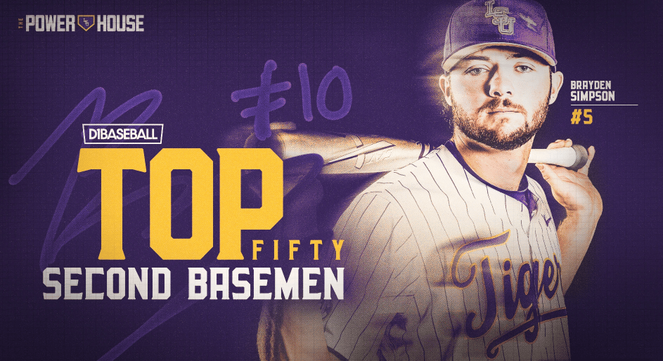 🔼 On Base. LSU’s Brayden Simpson checks in at No. 5 on the D1 Baseball list of Top 50 Second Basemen. The senior transferred to LSU after playing three season at High Point, where he earned 2025 NCBWA Third-Team All-American and First-Team All-Big South Conference honors. Simpson is a career .323 batter with 46 doubles, two triples, 37 homers, 136 RBI, 143 runs, and 29 stolen bases.