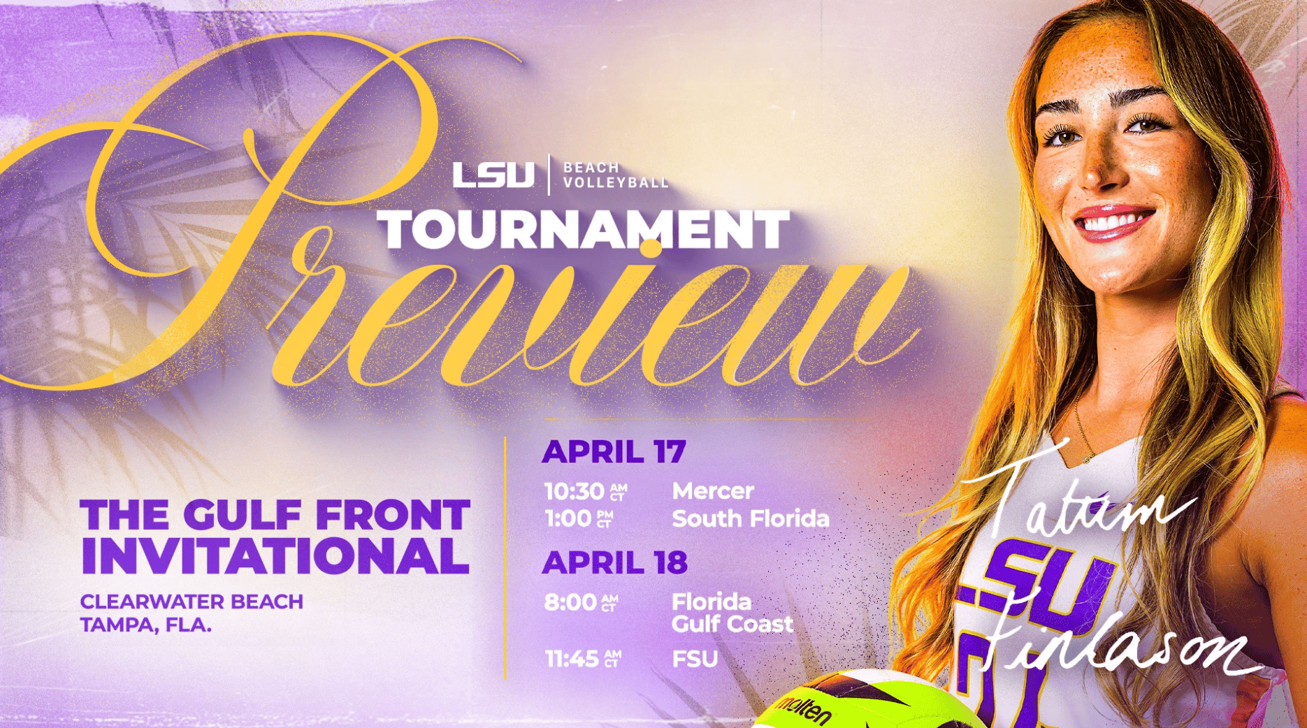 🔼 Gulf Front Test. No. 13 LSU beach volleyball heads to Clearwater Beach for the Gulf Front Invitational on April 17-18, taking on Mercer (today, 10:30 a.m. CT), South Florida (today, 1 p.m. CT), FGCU (Saturday, 8 a.m. CT), and No. 5 Florida State (Saturday, 11:45 a.m. CT) as the Tigers gear up for the postseason.