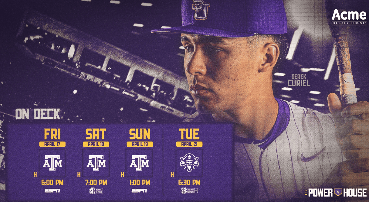 🔼 Up Next. LSU baseball hosts No. 7/9/10 Texas A&M this weekend, with games today at 6 p.m. (ESPN), Saturday at 7 p.m. (SEC Network), and Sunday at 1 p.m. (ESPN). The Tigers enter riding some offensive momentum; LSU hit three consecutive home runs twice in the past week, and leads the nation in strikeouts with 453 on the year. Jake Brown paces the offense with 15 homers and 49 RBI, while Derek Curiel is hitting .450 over the last 10 games with four homers and 17 RBI in that stretch. The Aggies bring one of the SEC's hottest records and a lineup led by Caden Sorrell (.368, 17 HR, 57 RBI).