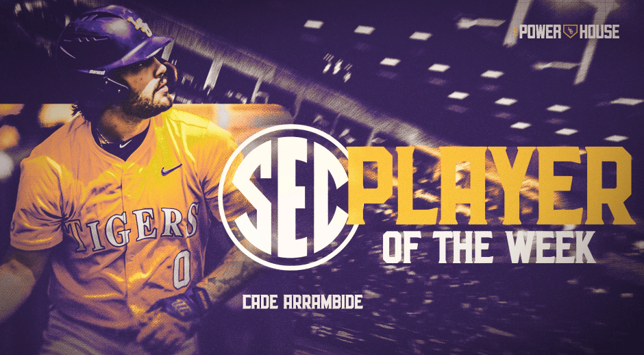 🔼 Player of the Week. Sophomore catcher Cade Arrambide earned SEC Co-Player of the Week honors after a monster week that included a record-breaking performance at Tennessee. Arrambide hit .600 across three games with four homers, eight RBI, six runs, and a .692 on-base percentage, leading LSU to a series victory over the Vols. Arrambide saved his best for Sunday's 16-6 series-clinching win, belting four home runs, including a grand slam that capped a 10-run 12th-inning explosion, to become just the fourth player in SEC history and the first in LSU history to go deep four times in a single game. His first homer sparked a comeback from a 5-0 deficit, and his third gave LSU the lead in the 11th before the grand slam blew the game open.